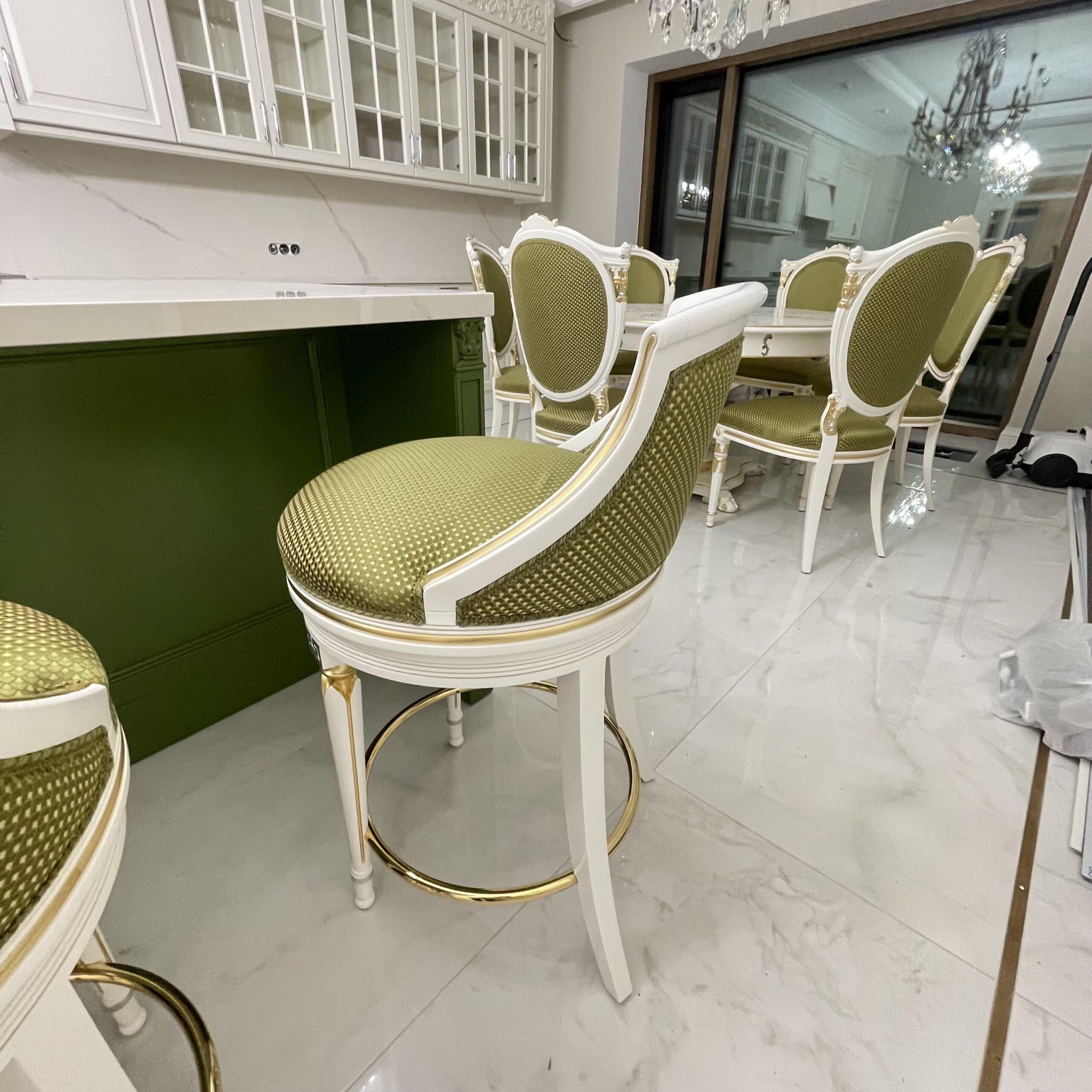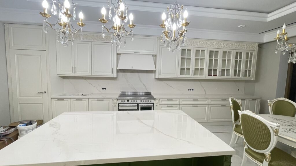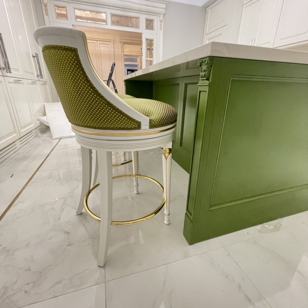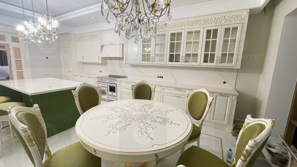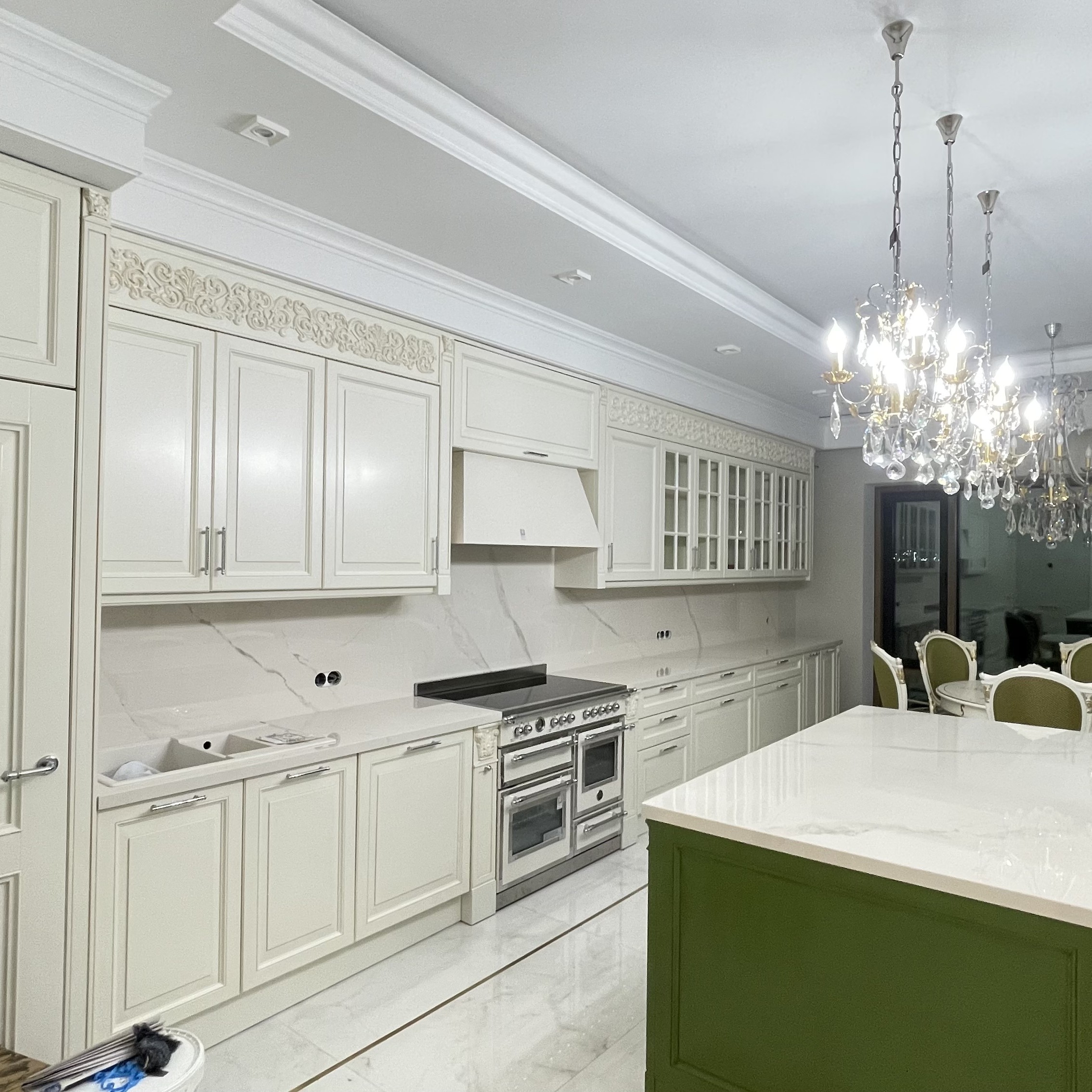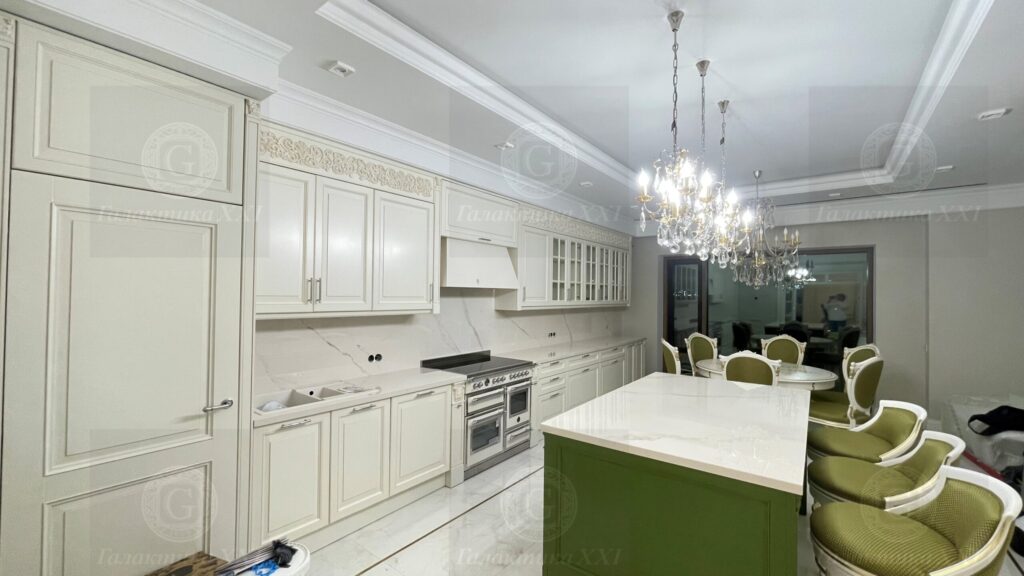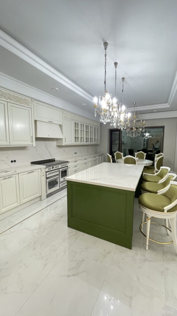 Преобладающая цветовая гамма – это светлые, пастельные тона: кремовый, бежевый, белый, оттенки мрамора. Ярким акцентом выступает насыщенный оливковый цвет кухонного острова и обивки стульев. Это сочетание создает ощущение свежести и элегантности. Освещение очень яркое и рассеянное, льющееся из множества источников. Центральное место занимают две массивные хрустальных люстры, которые бросают теплый, золотистый свет, подчеркивая изысканность интерьера.