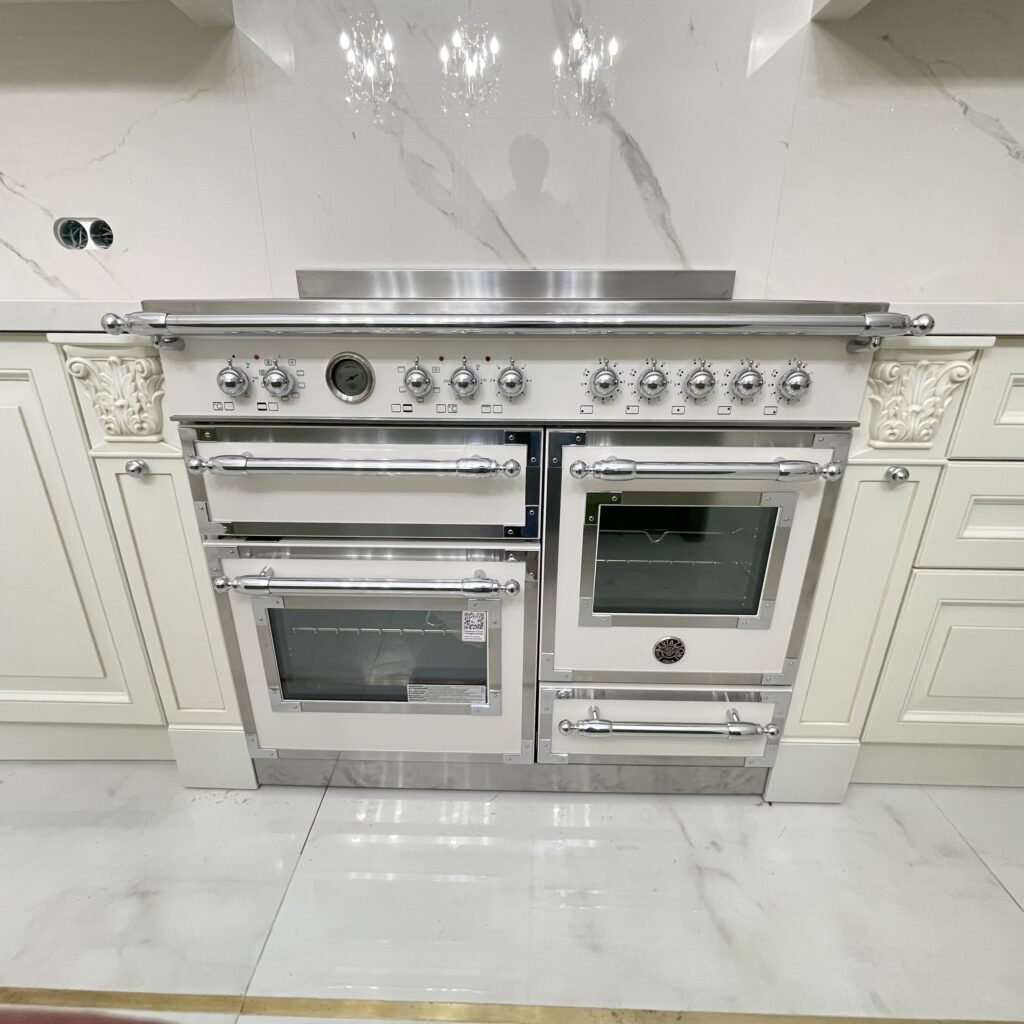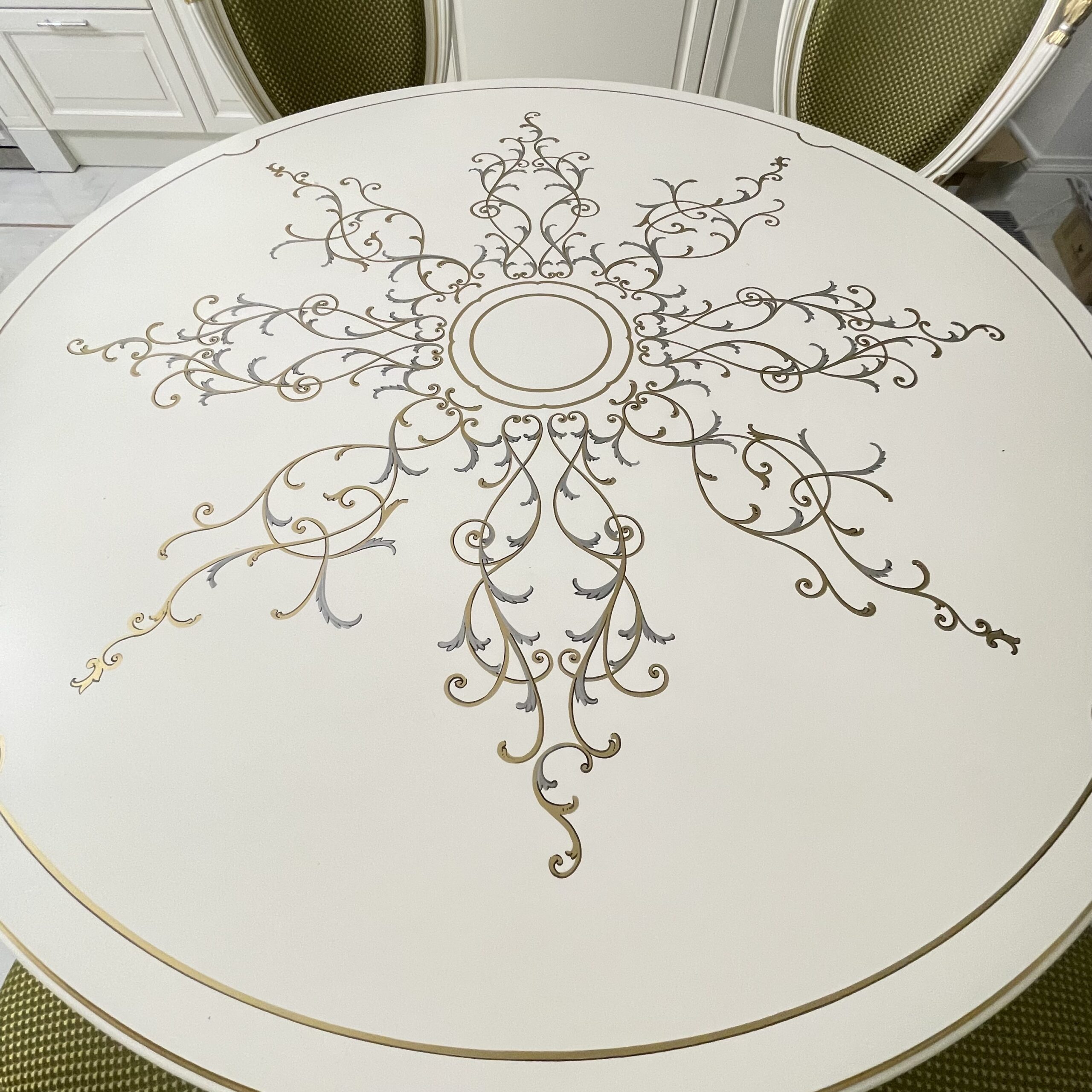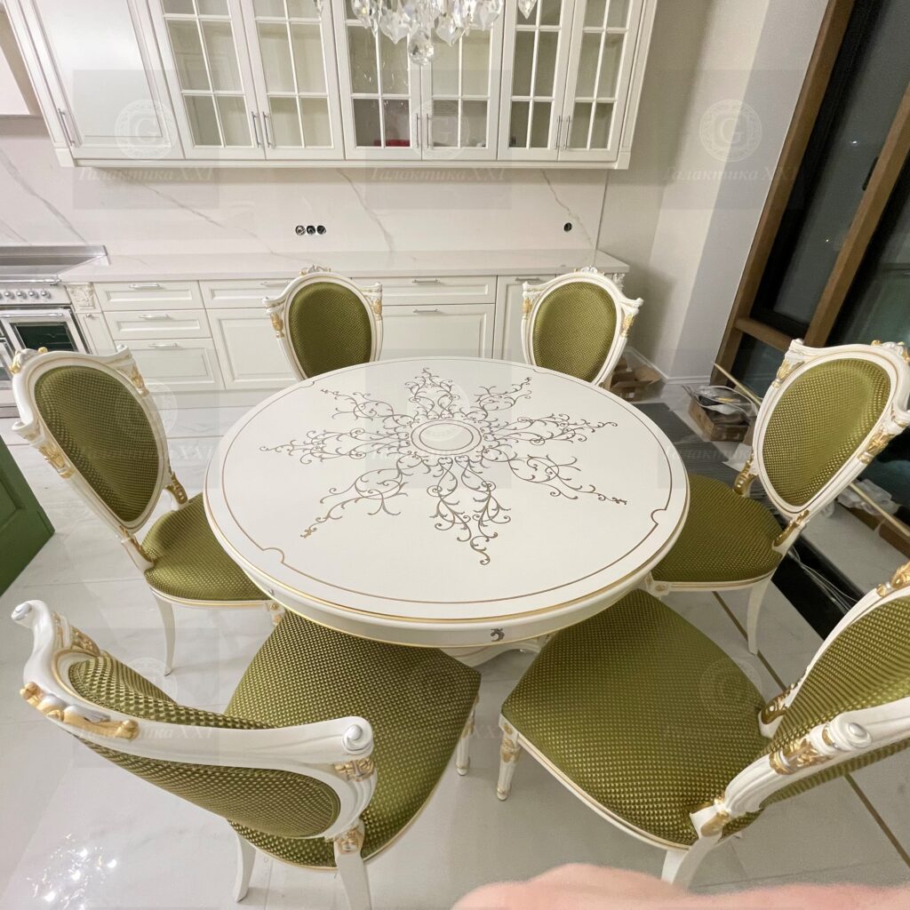 Перед нами предстает просторная кухня-столовая, выполненная в классическом стиле с резными элементами. В центре внимания – большая кухонная зона с островом фабрики Martini Mobili. Слева от острова располагается линейный кухонный гарнитур, включающий в себя верхние и нижние шкафы, вытяжку и варочный модуль. На противоположной стене установлен блок из больших вместительных шкафов со встраиваемыми холодильниками. Напротив острова, рядом с окном, находится обеденная зона с круглым столом от фабрики Ceppi Style и стульями Angelo Cappellini.