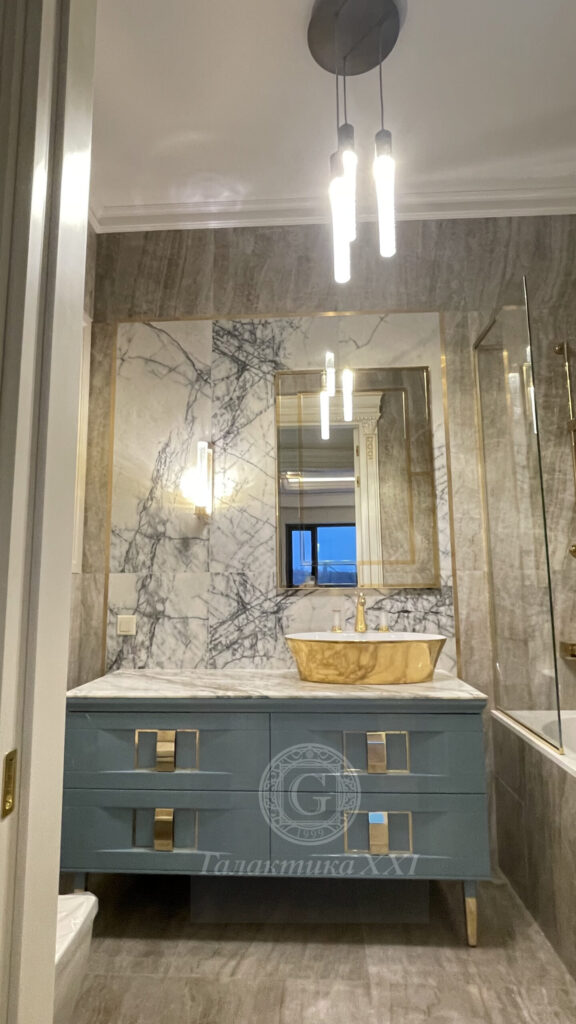 Интерьер выдержан в современном, элегантном стиле с элементами гламура или ар-деко. Сочетание мрамора, золота и геометрических форм создает ощущение роскоши и утонченности.