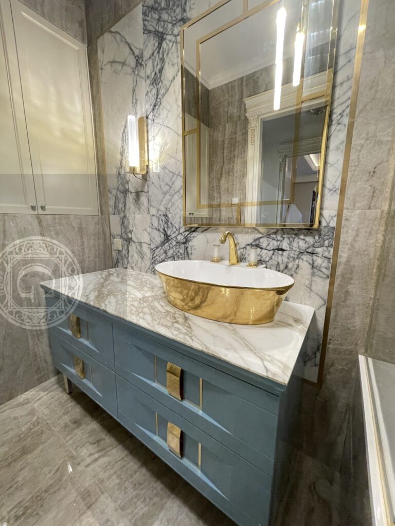 Центральным элементом ванной комнаты является тумба с раковиной фабрики Oasis (Италия). Она выполнена в глубоком синем цвете, с четырьмя выдвижными ящиками. Фасады ящиков украшены золотыми прямоугольными ручками оригинальной формы. Верхнюю поверхность тумбы украшает мраморная плита. На мраморной столешнице установлена золотая, рельефная раковина овальной формы. Она выглядит очень эффектно и является ярким акцентом. Над раковиной висит большое зеркало в золотой раме. Золотая рама перекликается с цветом раковины и ручек, добавляя единства интерьеру.