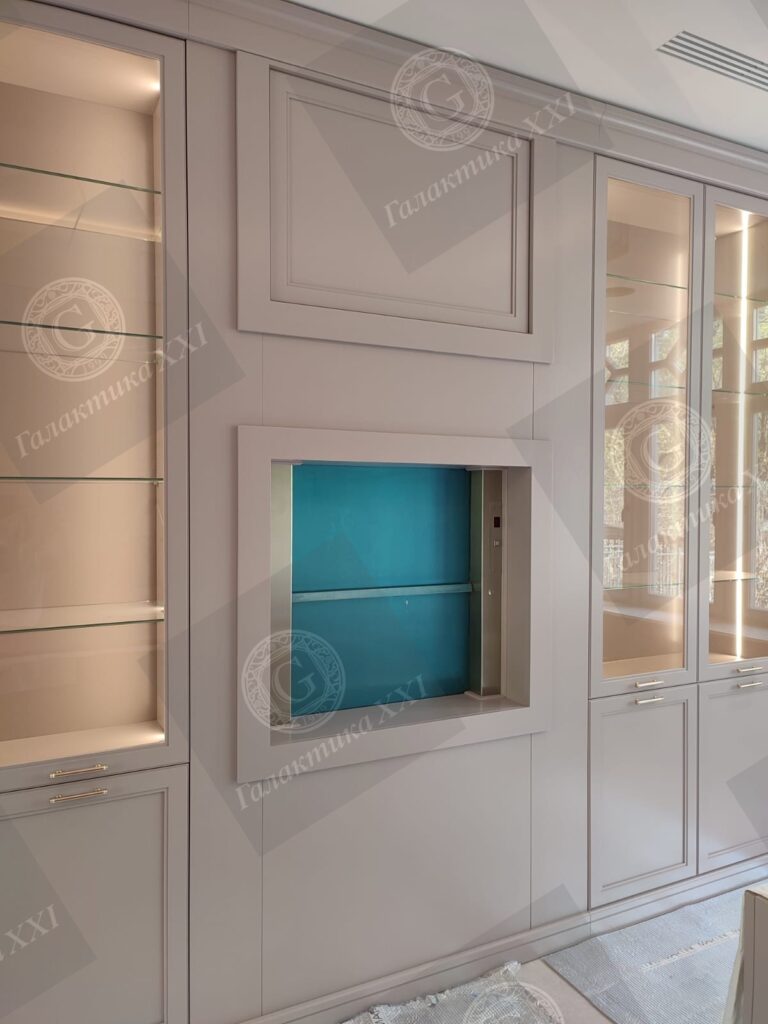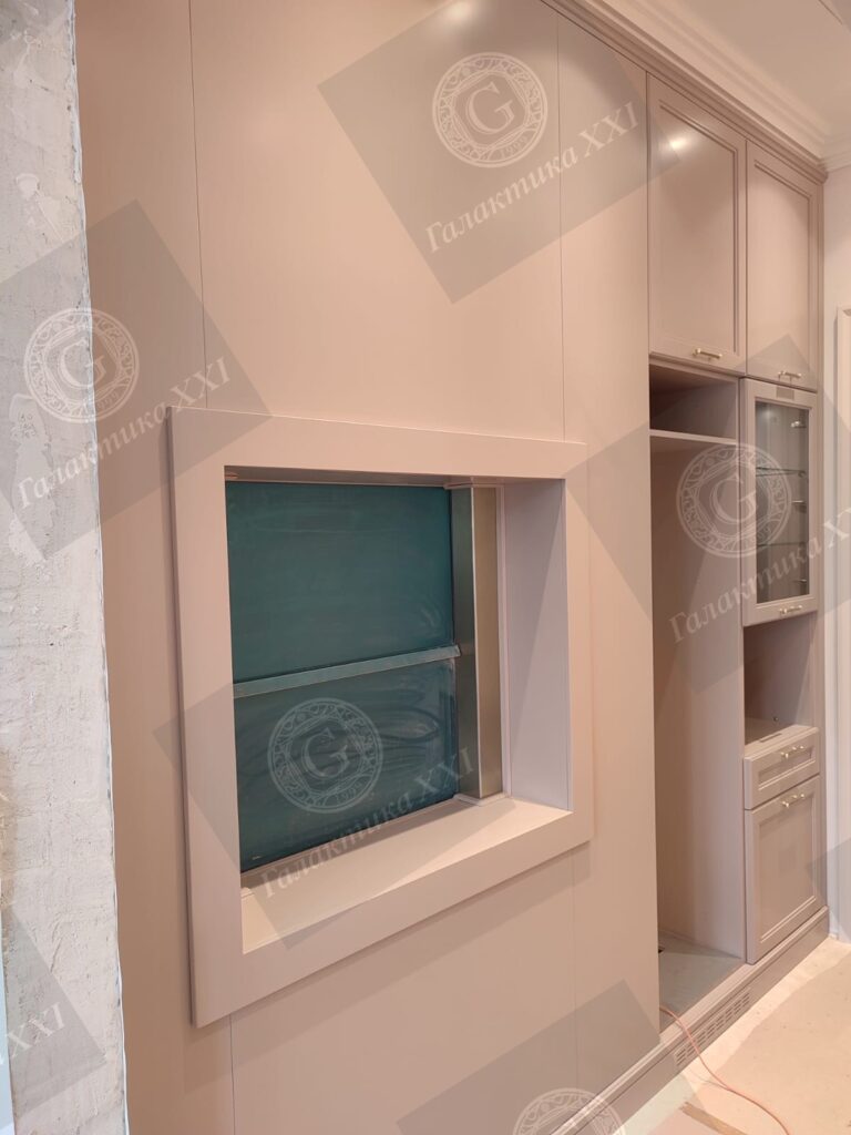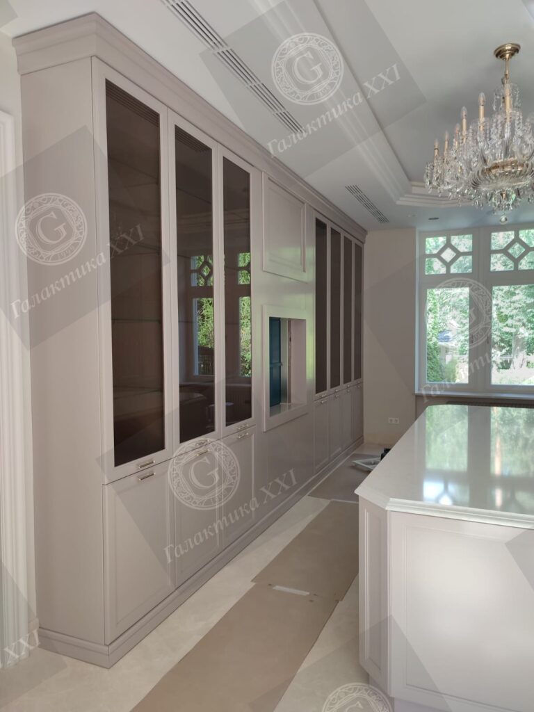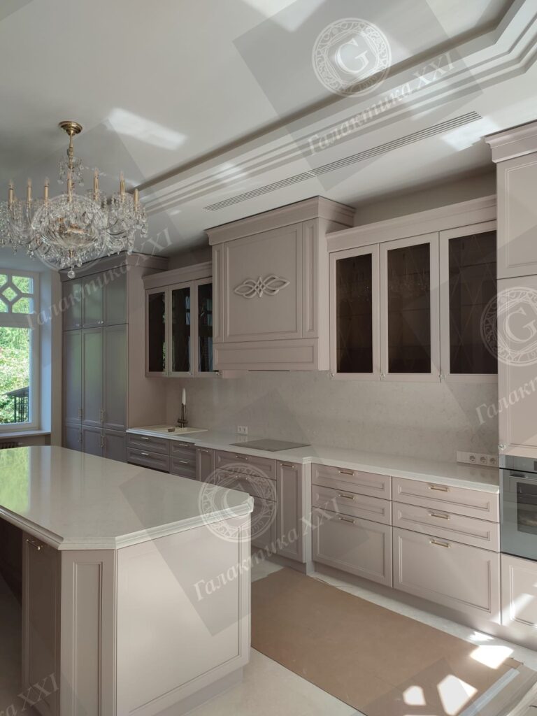Перед нами просторная, светлая кухня, выполненная в стиле современной классики с элементами роскоши от итальянской фабрики Martini Mobili. Центральное место в композиции занимает большой кухонный остров с массивной столешницей из светлого камня, имеющей скошенные края. Основная рабочая зона кухни расположена вдоль стены. Здесь находится большая рабочая поверхность из того же светлого камня, что и на острове. Вдоль стены размещены кухонные шкафы и ящики. Верхние шкафы, в отличие от напольных, имеют стеклянные дверцы, обрамленные изящной светлой рамой. Центральное место в верхнем ряду занимает декоративный короб вытяжки, украшенный элегантным рельефным узором в виде завитка. Напольные ящики и шкафы выполнены в приятном бежево-розовом оттенке, их фасады имеют фрезеровку, создающую эффект гладких панелей, обрамленных более темными контурами. Справа от основной рабочей зоны располагается блок шкафов со встроенной бытовой техникой. На противоположной стене размещены высокие, встроенные шкафы и обрамленный в стеновые панели лифт. Высокие шкафы, по обеим сторонам от лифта, представляют собой стеклянные витрины с полками, подсвеченными теплым золотистым светом. В них могут храниться декоративные предметы или посуда. Нижняя часть шкафов представляет собой закрытые секции с филенчатыми фасадами и элегантными металлическими ручками.