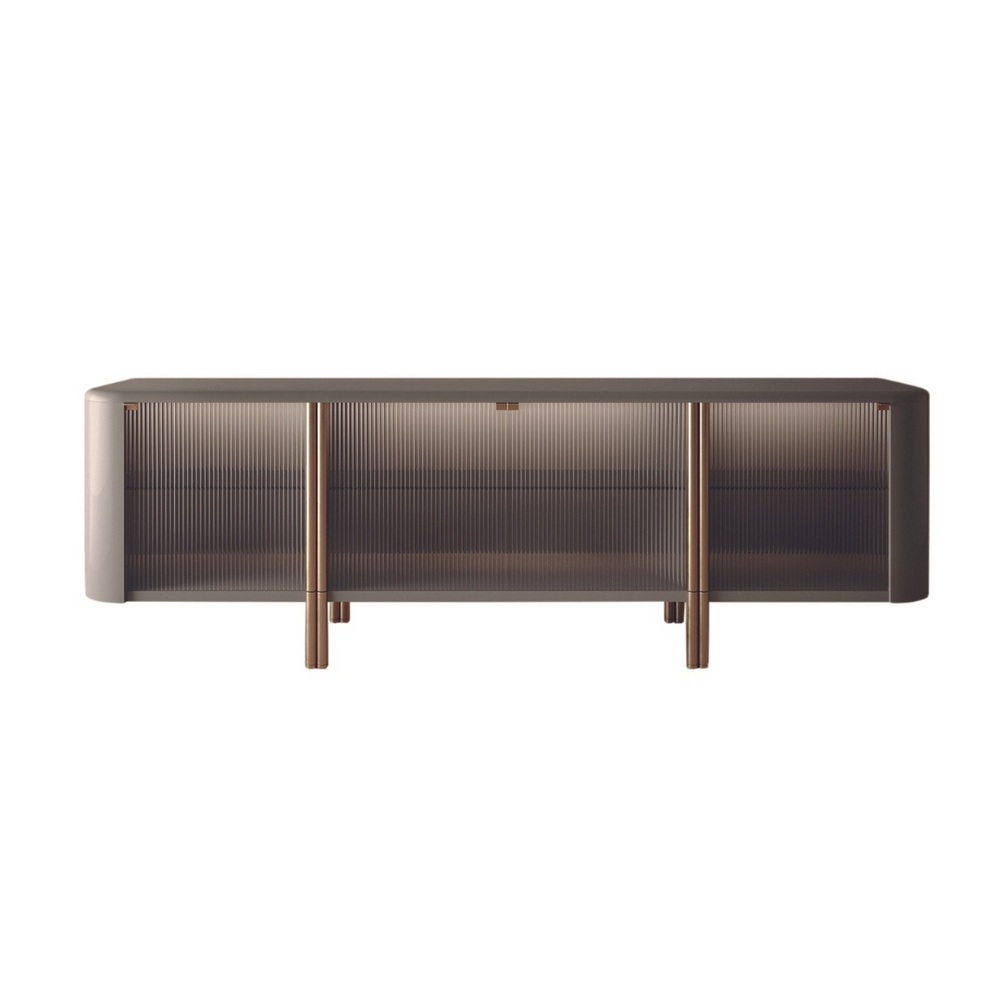 Современный и изысканный буфет, благодаря сочетанию материалов, из которых он состоит: латунь для конструкции, закаленное рифленое стекло для дверей и лакированная отделка в нескольких модных цветах.