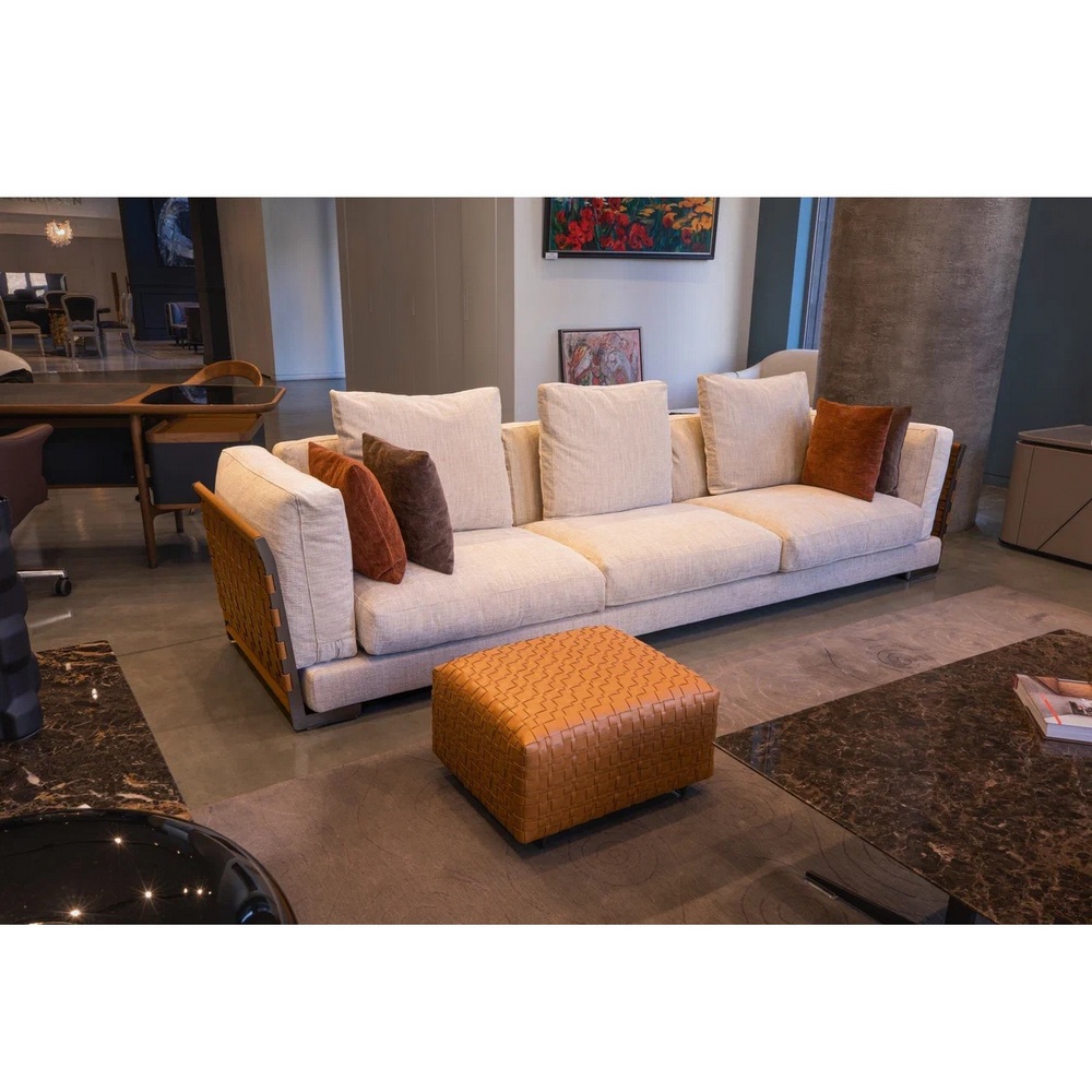 Диван Cestone предназначен специально для размещения в центре гостиной. В этом диване особое внимание уделено задней стороне спинки и боковинам, то есть тем частям, которые обычно являются неприметными. В диване Cestone, напротив, спинка и боковины выглядят привлекательно: они имеют металлический каркас, обтянутый кожаным плетением. Плетение имеет неоднородный вид, так выполнено из узких и широких кожаных полос. Образуемый шахматный узор создает впечатляющий эстетический эффект и служит приятным контрастом с мягкими частями дивана, наделенными плавными линиями и идеальными пропорциями. В стоимость дивана входят декоративные подушки 40х40х — 4 шт.