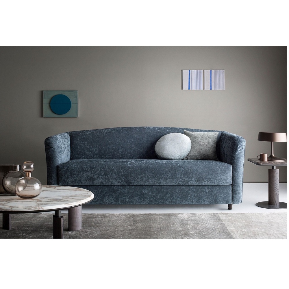 2-3-местный диван-кровать в стиле ар-деко, с верблюжьей спинкой, сиденьем с одной подушкой и слегка расклешенными подлокотниками. Он превращается в односпальную кровать, двуспальную кровать или кровать king size. Механизм Lampolet и открытый спиральный матрас. Из ткани, кожи, бархата.