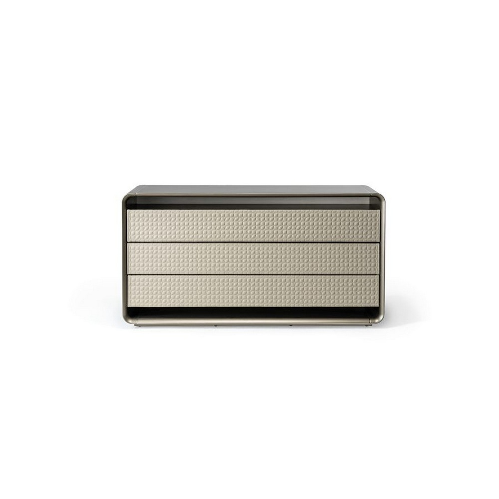 Комод с фигурной структурой из окрашенного дерева с отделкой металл бронза, латунь, темная латунь и титан. Оборудован 3 ящиками с кожаной обивкой и стеганой тканью.