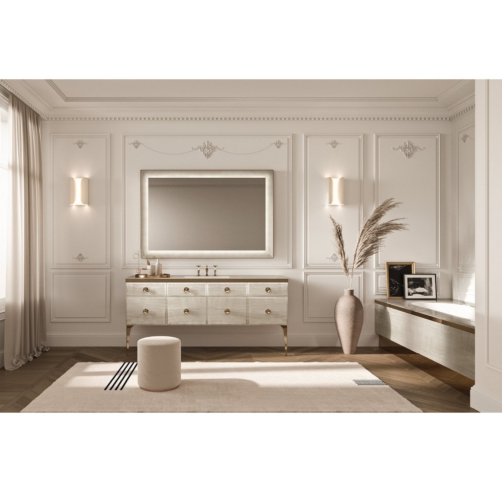 Тумба для умывальника с ультра прозрачным золотом, алебастровым стеклом со скошенным краем. Антверпенская сталь, бронза, верхний профиль и ножки. Столешница из золотого алебастра из сверхпрозрачного стекла и умывальник Panama 47 под столешницу из белой керамики. Зеркальная рамка Lausanne со светодиодной подсветкой, сверхпрозрачное золотое алебастровое стекло, бронзовый стальной профиль. Состав: Тумба для умывальника: 180 х 55,2 х 48 см
