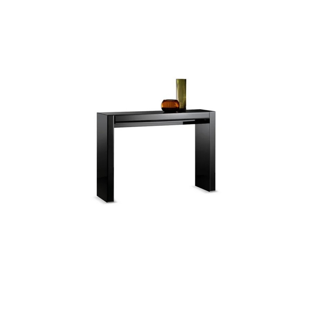 Консоль со структурой из глянцевого лакированного дерева с окрашенным и скошенным стеклом сверху и спереди. Выдвижной ящик с отделением для ручек. Опционально с гравированными дверцами.