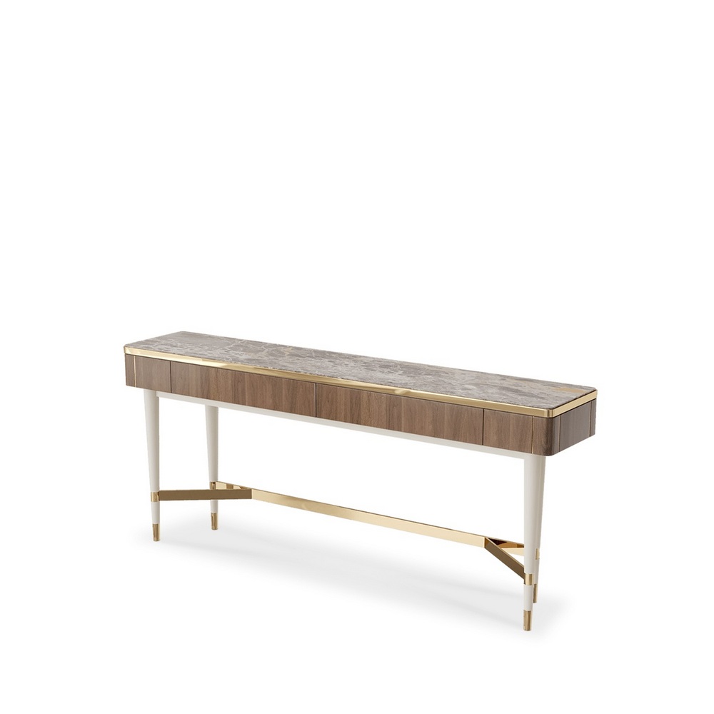 Консоль с 2 ящиками, каменной столешницей и металлическими деталями.