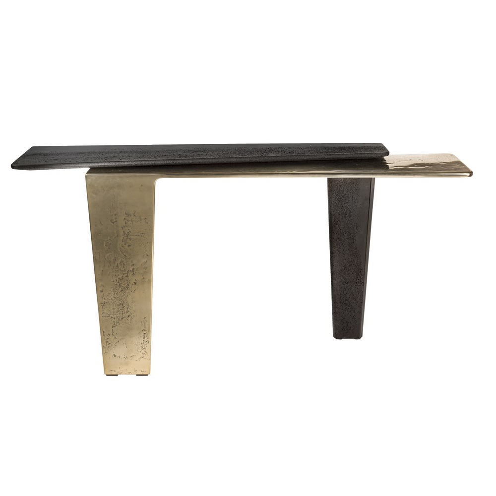 Консоль выполнена из бетона, покрытого черным воском с эффектом старения, и литого алюминия золотого цвета.