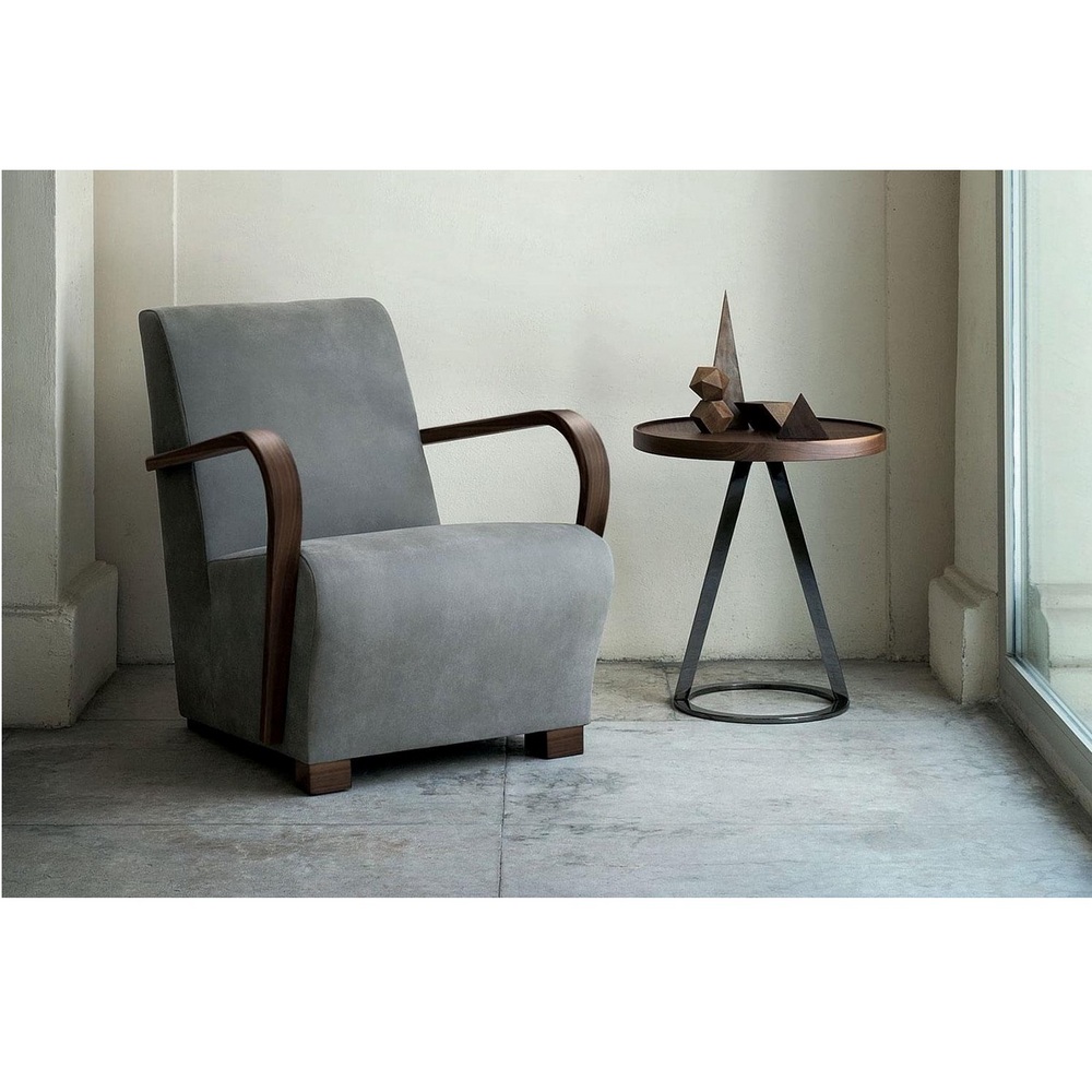 Мягкое кресло из гнутого дерева с изогнутыми подлокотниками, изготовленное из ценного массива ореха. Утонченный эффектный предмет в стиле ретро, с низким сиденьем и массивными блочными ножками. Из ткани, бархата или кожи.