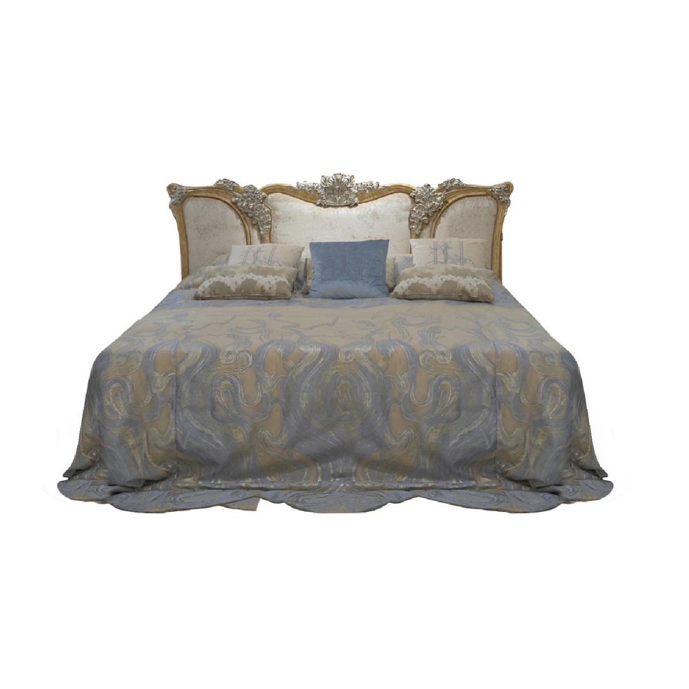 Кровать с деревянной конструкцией. Изголовье с мягкой обивкой. Обтянуто тканью или кожей.