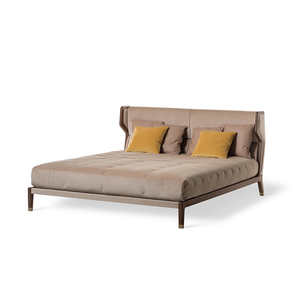Конструкция кровати выполнена из дерева, изголовье обтянуто тканью или кожей. Металлические детали покрыты матовым золотым лаком.