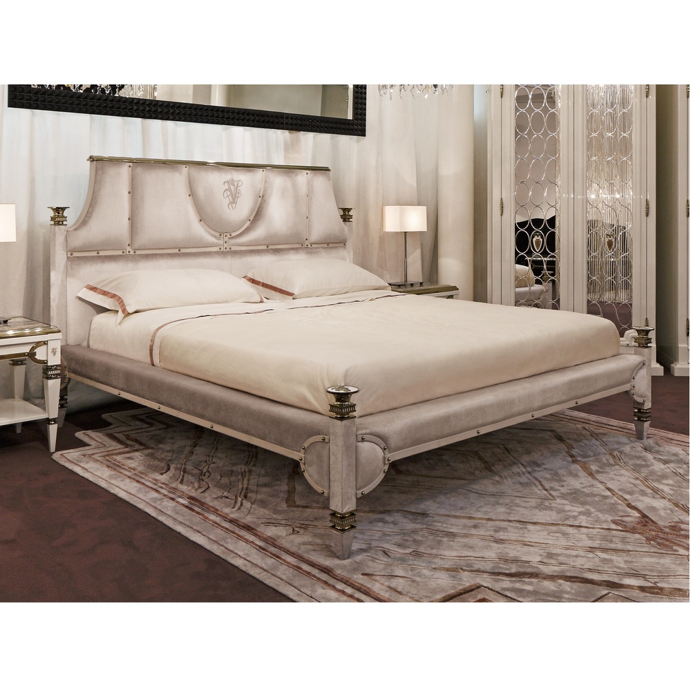 Стеганая кровать, обитая кожей или тканью. Конструкция изголовья и изножья кровати из тополиной фанеры, обитой полиуретаном. Вышитые логотипы. По бокам длинные металлические полосы покрыты МДФ и обиты кожей или тканью. Металлические ножки обиты и украшены точеными алюминиевыми кольцами и ручками. Латунные гравированные логотипы. Деревянные планки опоры с четырьмя углами опоры и центральной планкой, не регулируемой по высоте. Вариант: металлические детали золотистого цвета/ бронзовый лак. Выпускается также в варианте с высоким или низким изножьем. Спальное место 180х200 и 200х200.