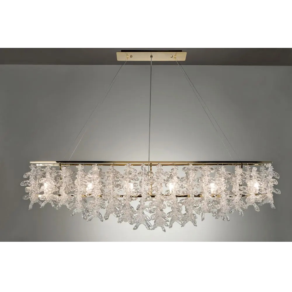 Люстра Frozen от фабрики Patrizia Garganti, состоит из прямоугольного основания, золотой рамы на тонких подвесах, и закрепленных на ней, прозрачных, стеклянных бус.