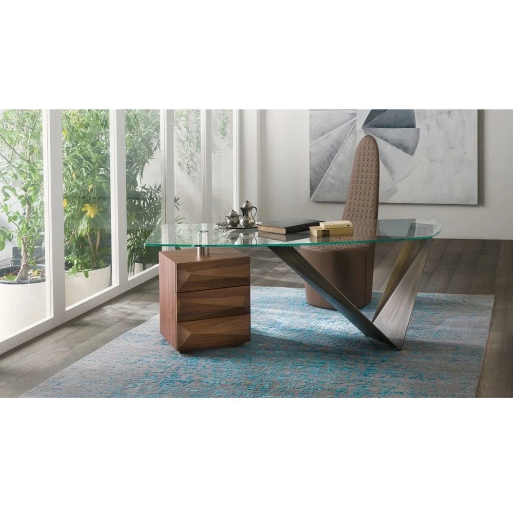 Письменный стол с металлическим основанием с отделкой из бронзы, латуни, темной латуни или титана. Фигурная столешница из прозрачного стекла толщиной 15 мм с полированным закаленным краем с отверстием для кабеля. Регулируемый комод с 3 ящиками и опорой из сатинированной стали, доступный в цветах Canaletto Walnut, Dark Ash и матовом окрашенном дереве с фигурными фасадами или покрытый окрашенным стеклом с прямыми фасадами. Верхние часы доступны по запросу в цвете Bevelwood, Canaletto, Walnut или Dark Ash.