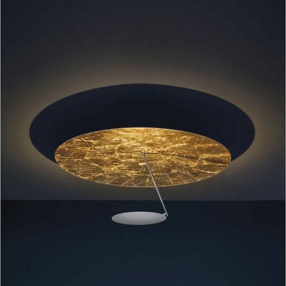 Потолочный светильник Lederam C150 – роскошная модель в современном стиле с элементами ар-деко, эффектно играющая с контрастными цветами и материалами отделки. Композиционно светильник представляет собой два диска разных размеров, соединенные между собой тонким металлическим стержнем. Плафоны в форме диска окружают светодиодный модуль плоской формы и полностью изготовлены из полированного алюминия.