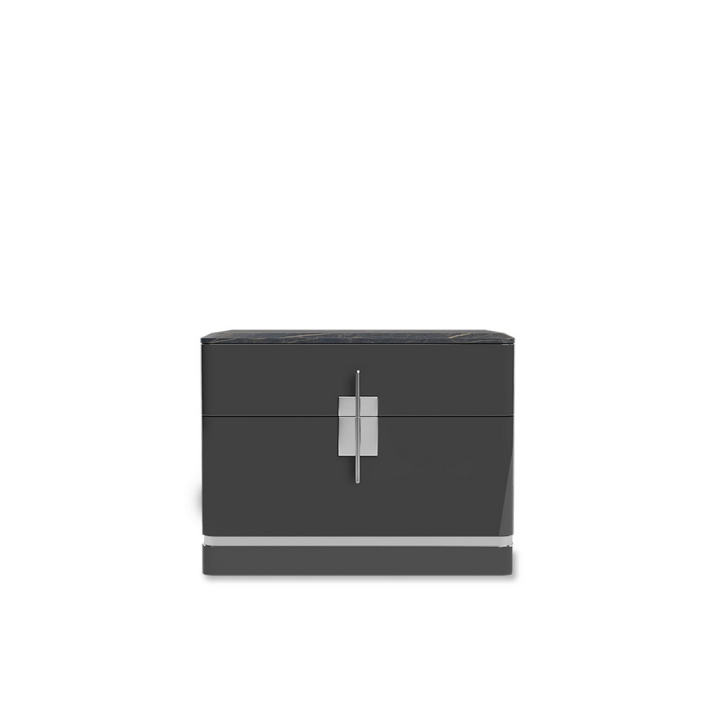 Лакированная глянцевая прикроватная тумбочка Batha с ручками из нержавеющей стали и мраморной столешницей.