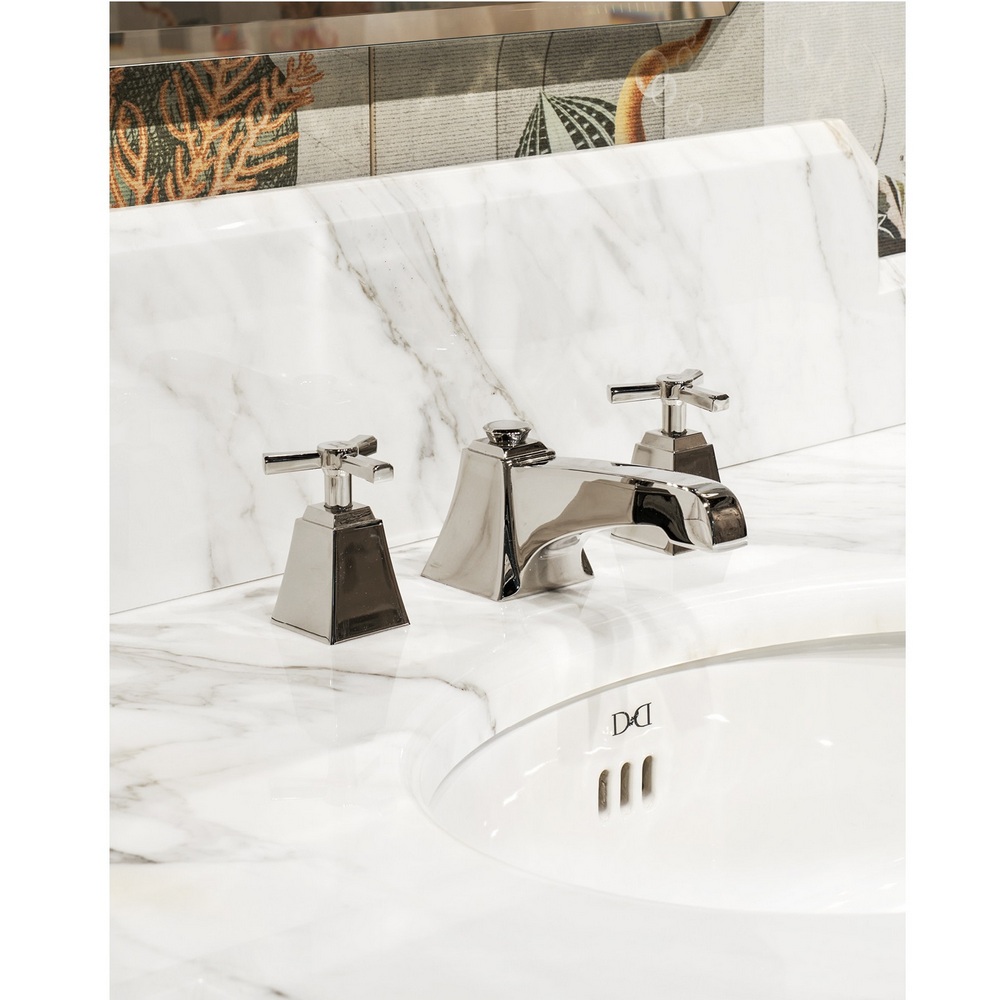Этот смеситель с 3 отверстиями и выдвижным сливом вдохновлен американским ар-деко 1930-х годов и переосмысливает его гармонию и пропорции в современном вкусе. Монолитная прочность, геометрические линии, отражающие и граненые поверхности явно вдохновлены стилем модерн. Он доступен в следующих вариантах отделки: античная медь, бронза, хром, полированный никель, черный никель, сатинированный никель, светлое золото и розовое золото.