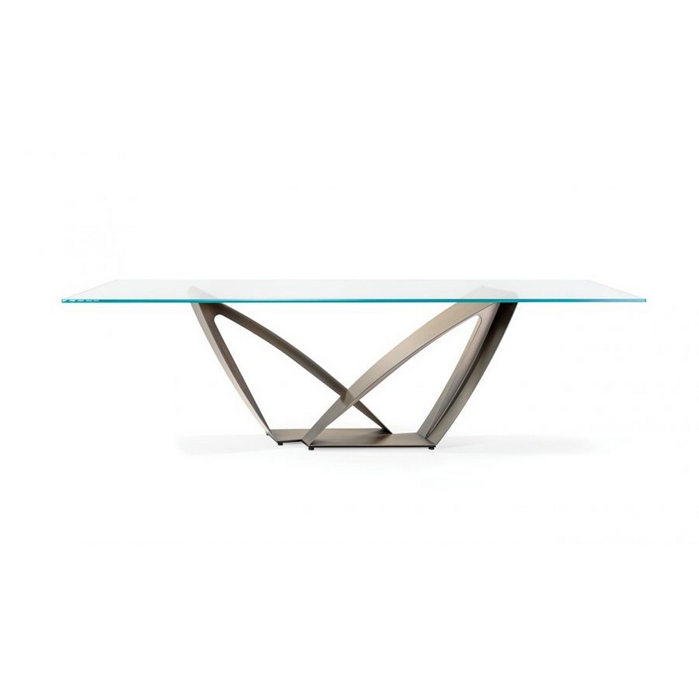 Обеденный стол с основанием из железа с отделкой Бронза (100M) или из сатинированной латуни (104M), темной латуни (105M), титана (101M).. Столешница из стекла, сверхпрозрачного стекла, дымчатого стекла, MarmoReflex или LegnoReflex. Столешница Bevel Wood в цвете Canaletto Walnut или в цвете Dark Frassimo. Столешница Bevel Wood с чехлом Marmoreflex/Legnoreflex.