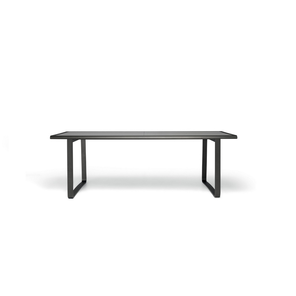 Обеденный стол коллекции Timeout интерпретирует архетип уличных столов с решетчатой столешницей для стока воды. Рассчитанный на 6 или 8 человек, он выделяется тщательно выверенными пропорциями и выбором материалов. Структура воспроизводит мотив полированной алюминиевой полосы с ее закругленным профилем и без углов. Как и во всей коллекции Timeout, опорные основания имеют форму салазок, созданных непрерывным движением той же металлической полосы и здесь расположенных вровень с верхней частью как ее естественное продолжение. Столешница доступна в двух вариантах: из цельных тиковых планок или из плит лавового камня в трех цветах — антрацит, оливково-зеленый и пустынно-желтый — со слегка шероховатой поверхностью, которая напоминает о его каменной природе.