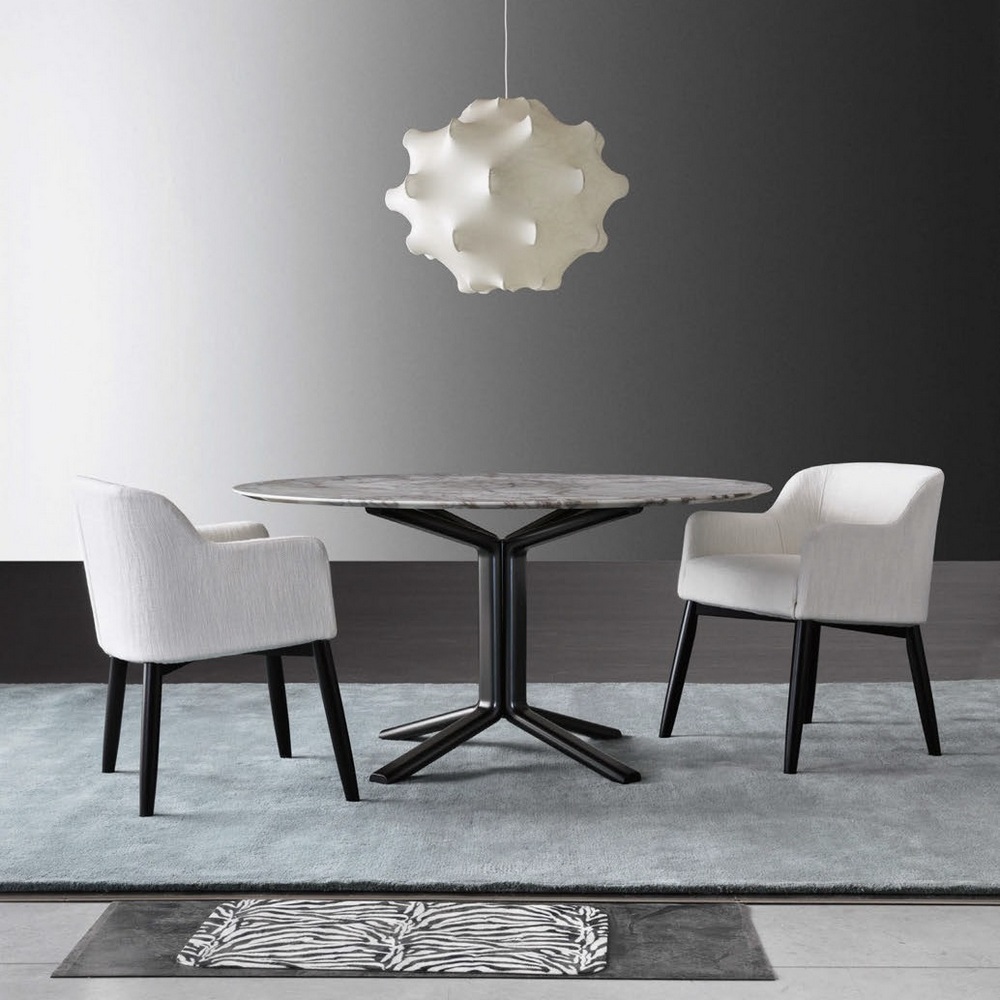 Этот обеденный стол сильно выделяется своеобразным основанием с четырьмя спицами, которые симметричны тем, которые поддерживают круглую столешницу. Широкий выбор отделки столешниц: дерево, матовый или глянцевый лак, вплоть до драгоценного мрамора и бронзовой латуни.
