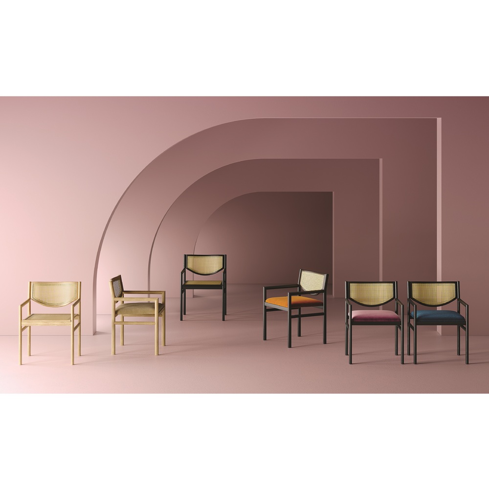 Стул KLARA с его неподвластным времени дизайном представлен в новом варианте с мягким сиденьем, обитым тканью или кожей, в дополнение к модели коллекции, отличающейся вечной элегантностью плетеной трости. Также доступен с матовой лакированной рамой.
