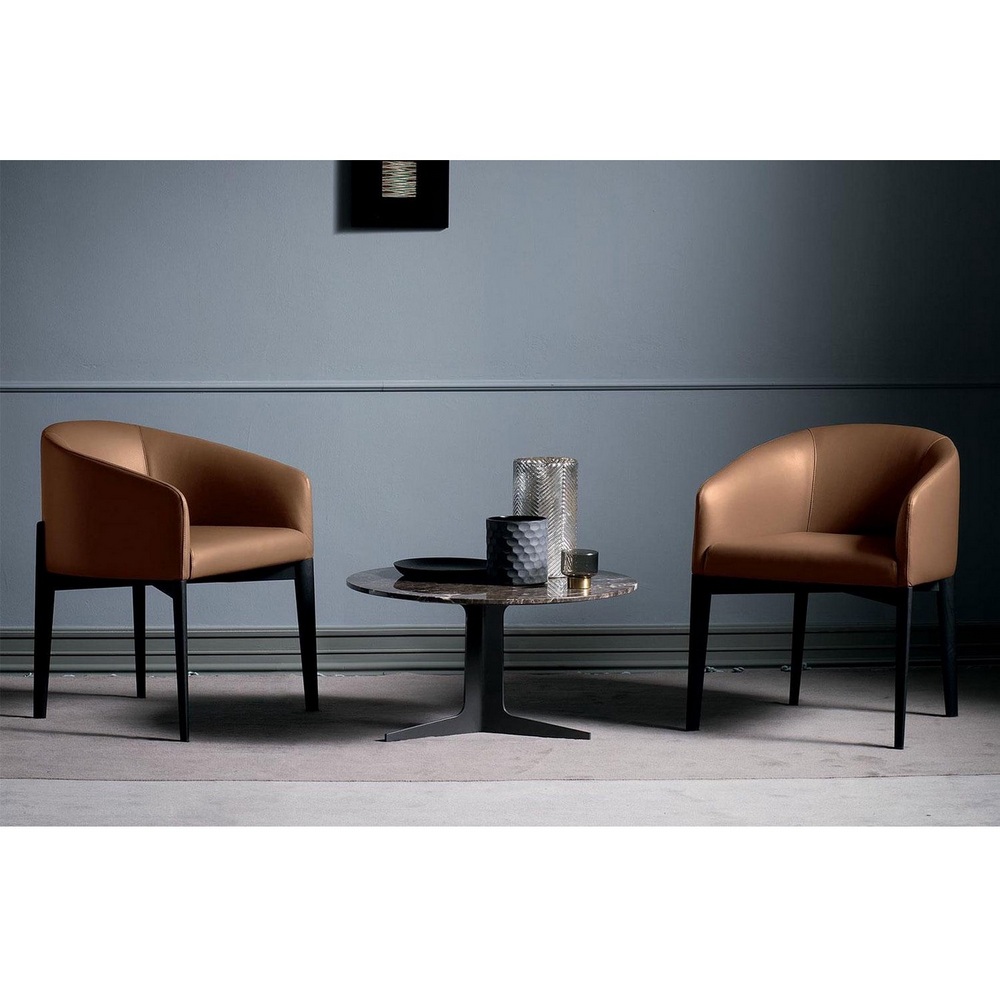 Современный обеденный стул с красиво выполненными ножками из черного дерева и мягким сиденьем с обхватывающими подлокотниками. Доступный в тканевом или кожаном исполнении, он имеет приятную изогнутую спинку.