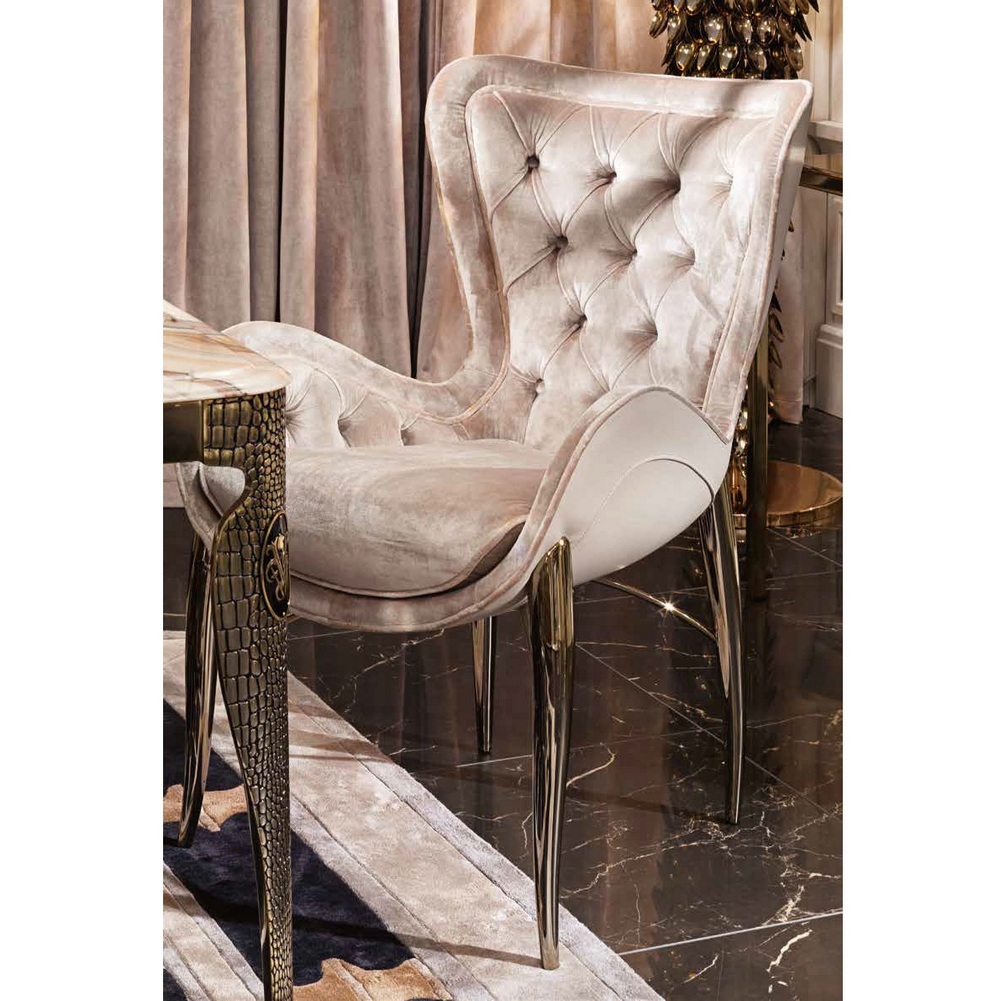 Стул обит кожей или тканью, с возможностью выбора двух различных цветов и внутренних узоров capitonné. Ножки из хромированной стали. На заднюю спинку сиденья нанесена декоративная кисточка из кожи и латуни. Вариант: золотой лакированный.