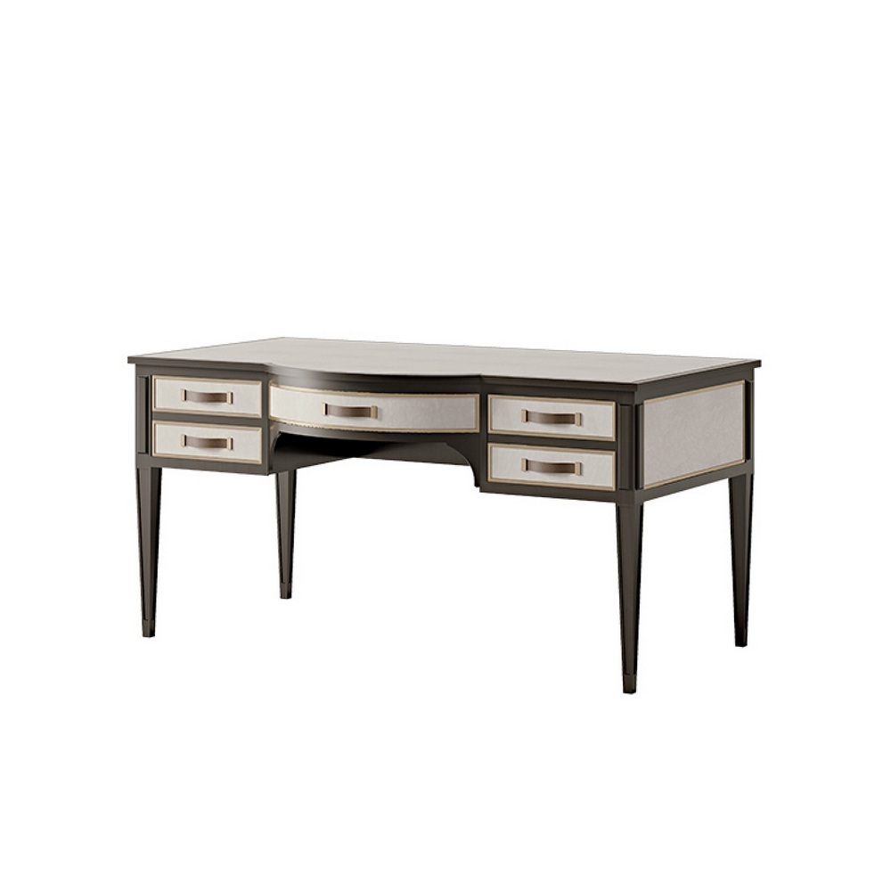 Деревянная конструкция. Кожаная столешница и кожаные ручки выдвижных ящиков. Детали отделки из бронзы.
