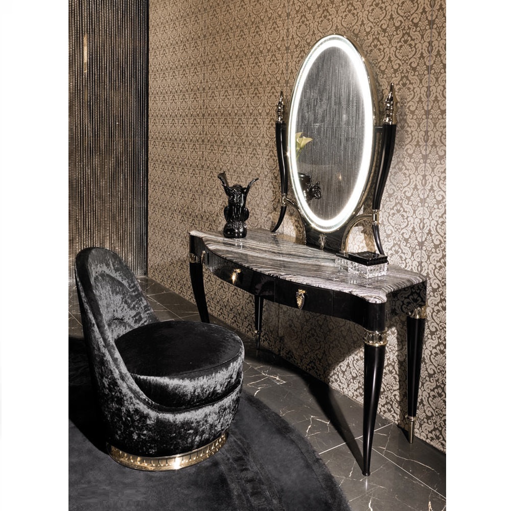 Структура из блестящего лакированного МДФ, снабженная 3 передними ящиками из изогнутого лакированного дерева, матовая лакированная внутренняя отделка. Столешница из фигурного скошенного мрамора. Овальное зеркало со светодиодной подсветкой из хромированной латуни, крепления из алюминия. Ножки сделаны из фигурных конусов из лакированной латуни с алюминиевыми поворотами и украшены овалами из блестящей нержавеющей стали или золотистым лаком.
