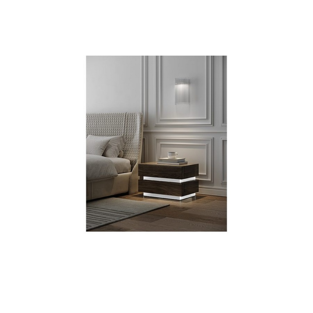 Тумба прикроватная с деревянными элементами с вкраплениями перегородок из травленого закаленного сверхпрозрачного стекла с внутренней светодиодной подсветкой. Столешница из окрашенного стекла для лакированной версии. Также доступны в вариантах глянцевого лакированного дерева и темного ясеня.