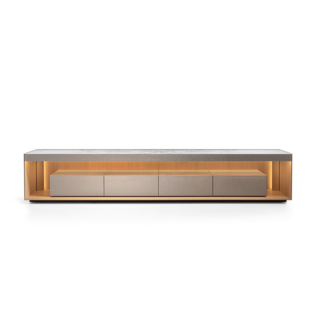 Living Box задумывался как самостоятельный предмет мебели, пригодный для использования в любой комнате дома, но в основном подходящий для гостиной. Несмотря на свои небольшие размеры, он сохраняет строгость и монументальность здания, из которого он происходит, подчеркивая его детали с помощью качественных материалов. Living Box представляет собой низкий, но большой (230, 280, 330, 380) прямоугольный контейнер без дверей, в котором снаружи и внутри контрастируют друг с другом за счет использования разных материалов. Верхняя часть отделана мрамором и различными породами дерева, специально расположенными для украшения поверхности. Все это заключено в ирисовую и оловянную раму, нитевидную, если смотреть сверху, но образующую толстый профиль, окружающий внутреннее пространство, если смотреть спереди. Насыщенное освещение обеспечивается светодиодами. Внутреннее пространство полностью свободно и лишено острых углов благодаря специальным изогнутым угловым крышкам. Если это сценографическое решение не соответствует назначению, можно добавить один или несколько строгих и элегантных наборов ящиков с отделкой ирисом и оловом или деревом и сдержанным и элегантным дизайном. Они занимают свободное пространство, скрывая то, что полезно, но желательно не видно. Наборы ящиков являются самостоятельными и могут быть размещены в любой части комнаты. Система комплектуется техническим контейнером для ленты, разработанным в соответствии со специфическими требованиями, связанными с миром видео – оборудованием HIFI.