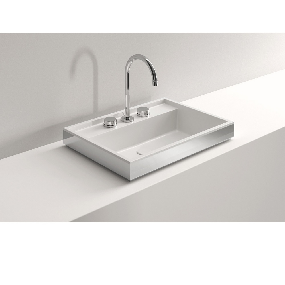 Накладная раковина из минерального мрамора с рамой из полированной стали, золота или черного хрома. 3 отверстия для крана, по запросу 0-1 отверстие для крана. Сток для непрерывного слива без водослива. Глубина чаши 13 см. Дизайн: Michele Marcon. Раковина доступна в 2-х размерах: 62 см и 80 см.