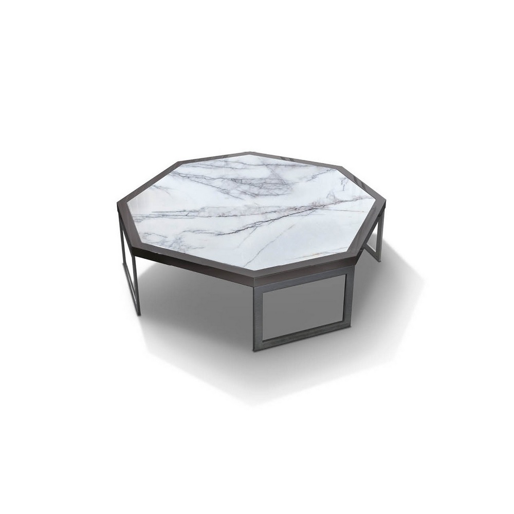 Восьмиугольный журнальный столик со столешницей из мрамора. Основа из черной никелевой стали.